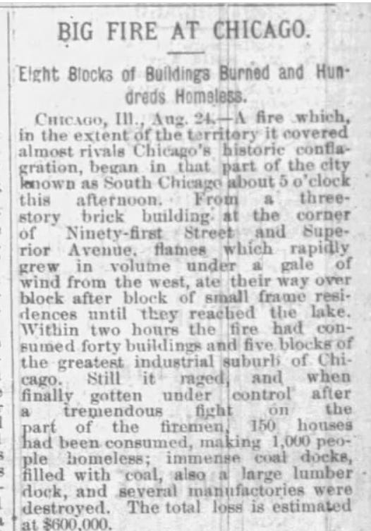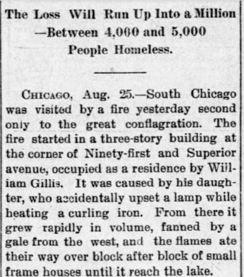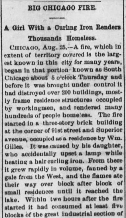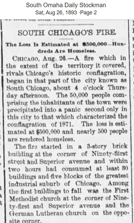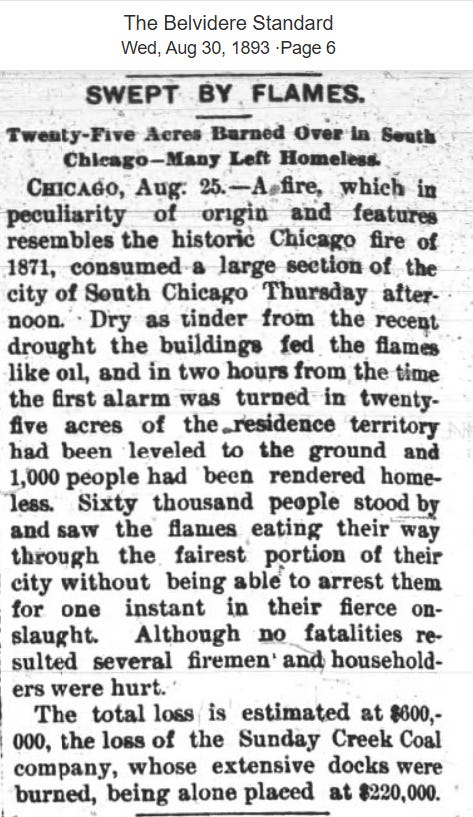 Leading up to the fair, in 1893, the newspapers reported on The GREAT Fire of 1871; an unexplainable and highly suspicious fire which quickly consumed the city, incinerating stone, burning through iron and steel, and reducing marble to ash, but a quick glance at the deceptive headline would lead one to believe this was a second massive fire: