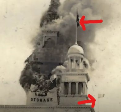 What if I told you the fair itself was on fire? Yep, they claim the fair itself partially went up in flames less than two months after it opened. Here are the “photos” showing the Cold Storage Building exploding: