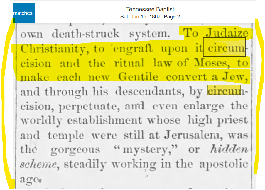 Come 1867, the Baptist Church had had enough of this newfangled idea of cutting up dicks. The Tennessee Baptist paper published a warning, quote, “To Judaize Christianity, to engraft upon it circumcision and the ritual law of Moses, to make each new Gentile convert a Jew, and through his descendants by circumcision perpetuate and even enlarge the worldly establishment whose high priest and temple were still at Jerusalem, was the gorgeous mystery or hidden scheme steadily working in the apostolic age”. The Baptist's warning did nothing to stop the snip-snip train.