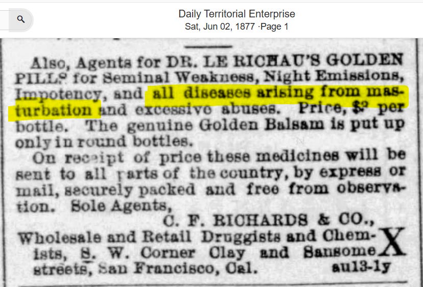It was now official, wanking off was indeed the cause of disease, and just like that, the cures sprang up like daisies. Take some golden pills and they will cure all diseases arising from masturbation, said the ad in the paper.