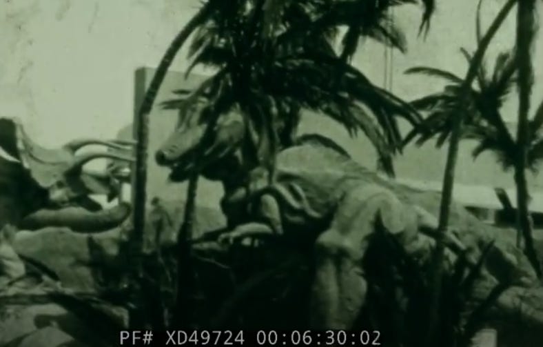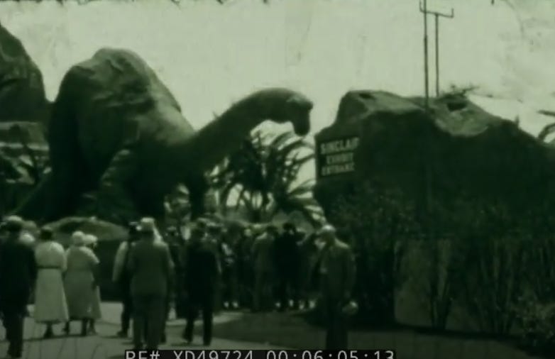 The true story about these alleged ancient beasts is, some bones were found in the ground and brought to a Royal Society guy who also worked for the government and military. He said they belonged to “extinct species”. This opened the door for Darwin to officially put the Theory of Evolution out there. Next, nearly all of the dinosaurs were discovered by the same two people - a Quaker oatmeal heir and a dude with an uncle who was so rich he had a city named after him. It was the uncle who opened museums to share the discoveries then created paleontology programs at colleges further the narrative. Meanwhile, the Quaker Oat dude wrote over 1,000 scientific papers which were used as confirmation of the findings. (1930s World Fair dinosaur exhibit:)