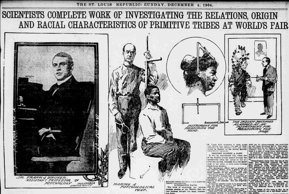 At another World’s Fairs, Anthropologist and Evolutionist William McGee was determined to prove the Theory of Evolution to fair attendees. His exhibit featured “the stages of evolution”, which displayed living human subjects who were subjected to experiments in a special laboratory set up by the Fair’s Anthropology Department. The laboratory tests were designed to prove inferiority by showing native people’s lack intelligence. The victims of these tests were also put through pain threshold studies on behalf of the Fair.