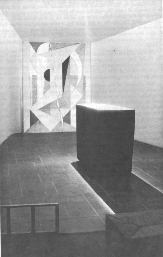 Upon entering, "The visitor will be totally unprepared for what he will see as he steps in the door for a moment of quiet. . . . Because of the converging walls and the dim light, he will experience a peculiar spatial disorientation, and dimension and perspective will seem difficult to establish. In the center of the room, he will see, illuminated by a single point of light from the ceiling, a rectangular mass…”