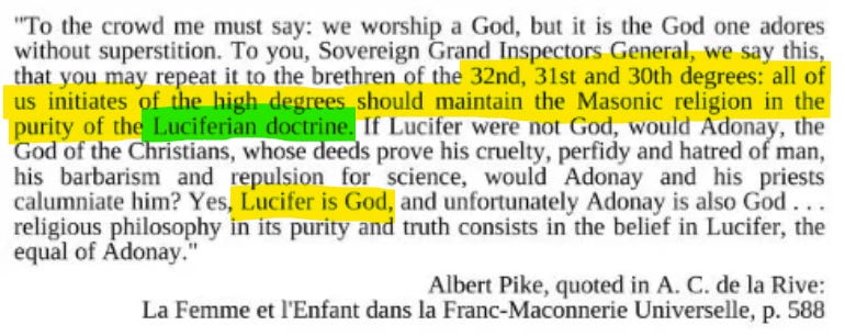 I have seen so much internet content in which Masons (or people who claim to be Masons) swear there is absolutely no Lucifer within Masonry. But as you can see, from Albert Pike himself, there is - but these teachings do not begin until the 30th degree, so any Mason under this level has yet to be approached with such. It’s like any other business, you don’t learn what actually goes on behind the scenes until you get into the top levels of management. I tried to explain this to a guy the other day by comparing it to Coca-Cola; do you think the president of the company calls the vending machine stockers into the board room to show them financial statements and review active lawsuits? Of course not. No company does this. Additionally, as many former Masons will tell you, on your journey through the brotherhood, they don’t outright tell you not to believe in Jesus, nor do they condemn Jesus verbally, what they do is not mention Jesus (or any god in any other religions except Allah). This means, as you go up the ranks and sit through “black masses” and rituals about being saved by “the Lord” and “resurrection”, you can choose to interpret it as meaning Jesus (or whomever your religion worships), but eventually, should your eyes open to the truth of the situation, you will discover all of this has been intricately designed to deceive you; Jesus is not the Lord being worshipped, hence the reason his name has been stricken and you are left choosing to interpret it as such.