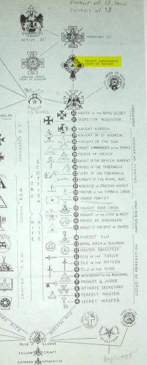 In Parts 1 - 4 of this series we looked at the Scottish Rite of Freemasonry and learned about its teachings as well as what the upper levels of the organization are involved in. Today we are going to discuss where Masons are mentally prior to entering the 33rd Degree Knight Commander Court of Honor (KCCH) because this is super important to understand. Here’s the chart so far: