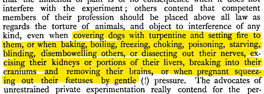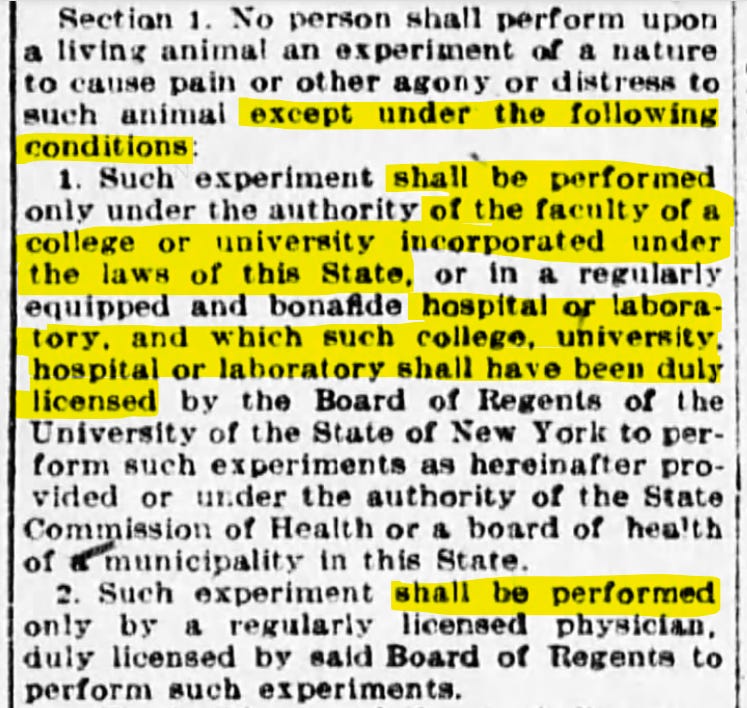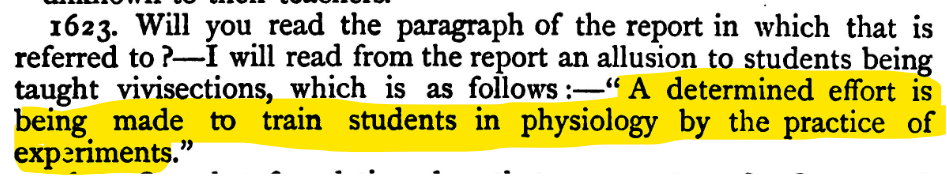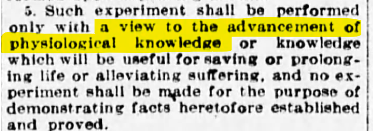 ….so, as long as the purpose is labeled “the advancement of physiological knowledge” and as long as a bonified college, hospital or laboratory is involved, the diabolical practices of the dark arts could continue on…