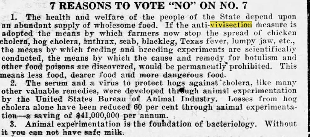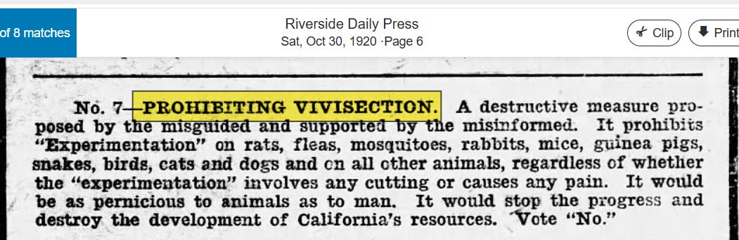 In October of that year, an election year, the people of California were told ending vivisection (“Proposal No. 7”) was a destructive measure created by the misguided and supported by the misinformed.