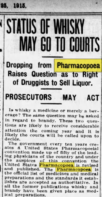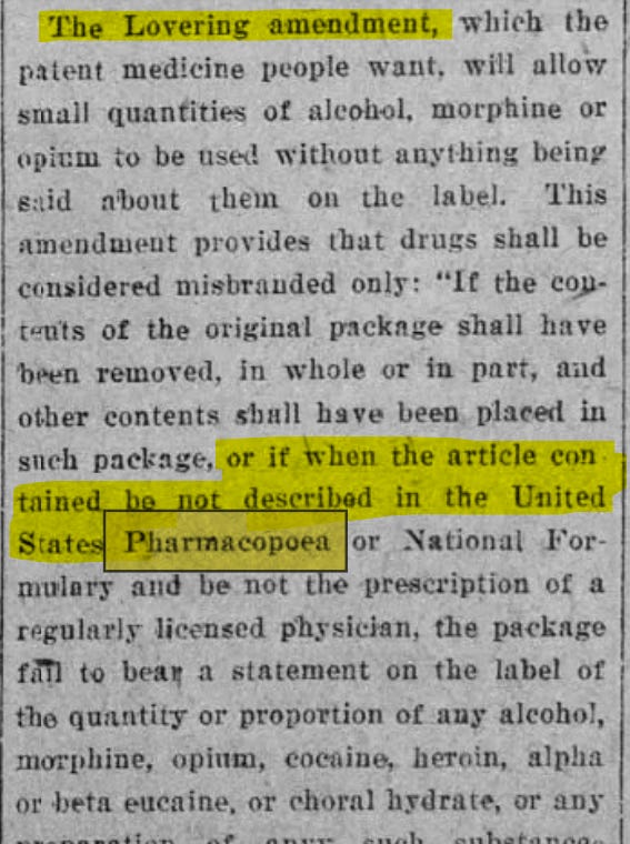 Let’s get back to the timeline: As I was saying, the US government was looking at passing the labeling laws, so the medicine men insisted on The Lovering Amendment which would allow for them to put small quantities of anything into their pills, powders and potions providing it was okayed in the Pharmacopeia book, their medical bible.