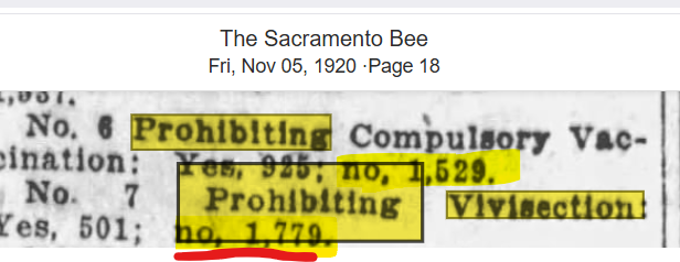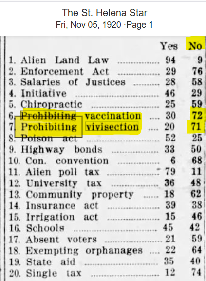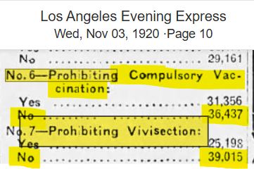 These “Vote No on Proposal 7” campaigns flooded the highly-controlled papers. The following month, November, when the votes were tallied in California cities, the torture rituals were given the green light to keep going and all efforts to eliminate vaccinations were squashed.
