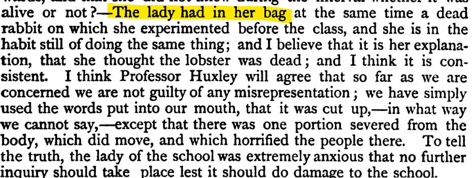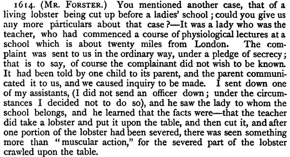 In one school, a teacher brought a dead rabbit in her purse along with a living lobster. The lobster, dying from lack of water, was placed on a table and tortured in front of a class of young, female students. The little girls watched in horror as the teacher hacked off the lobster’s claws and let it die in pain in front of them. The dead rabbit was then experimented on. Only one child was brave enough to tell her parents what was happening in class which she claimed was now occurring on a regular basis. When the Royal Society confronted the school, the principal was “extremely anxious that no further inquiry should take place…”