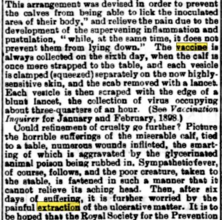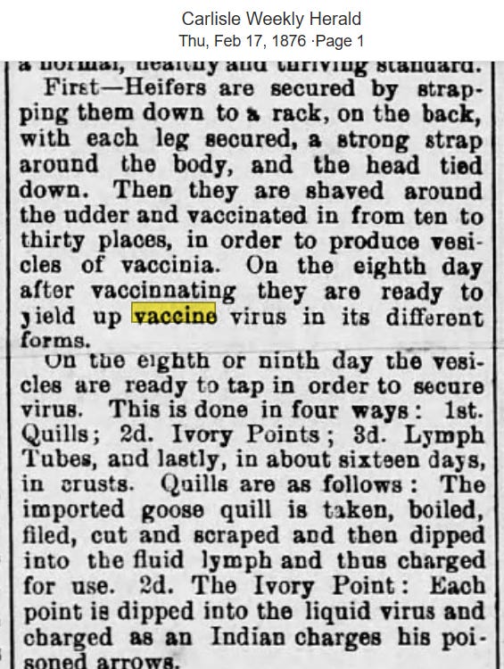 1889 Cruelty to Calves https://www.newspapers.com/image/794596479/?match=1&terms=vaccine%20lymph%20extraction