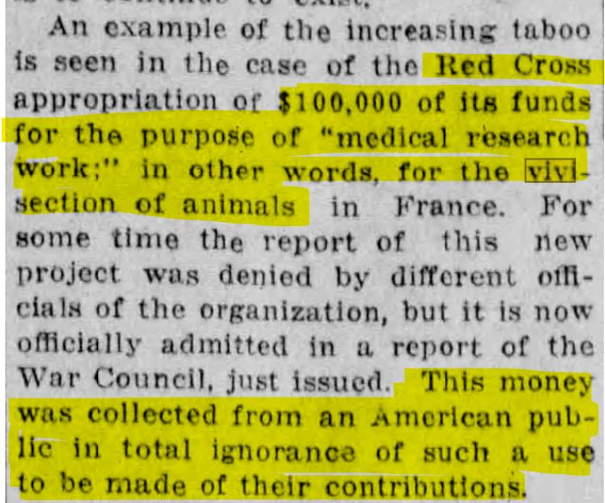 In 1918 it was discovered the Red Cross (Rothschild) was also involved in animal torture. It turned out they sought donations from the American public to save injured people then quietly appropriated $100,000 of the funds to evil animal experimentation in France (equal to over $2 million in today’s currency).
