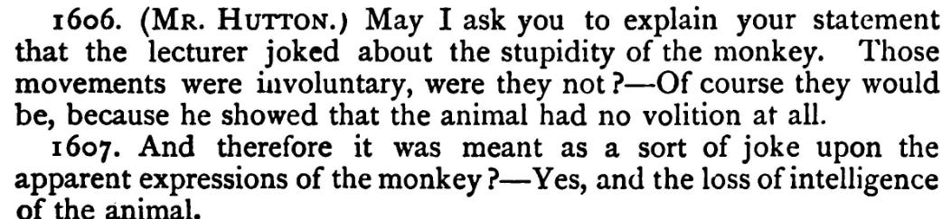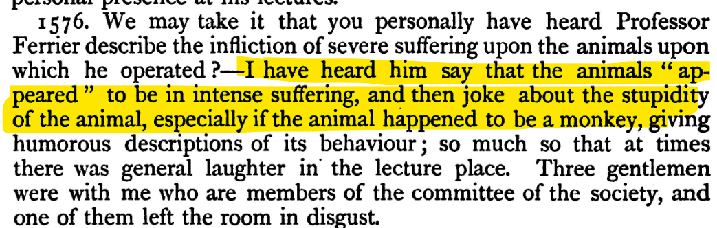 Lectures were given in which a professor would experiment on a monkey, slicing through it’s skull and into it’s brain, causing it severe suffering and retardation. The Royal Society infiltrated one of his lectures and watched the professor brag about the intense suffering he caused to the animal and joke about the injured creature’s “stupidity” after the surgery. The professor found it to be hilarious that the monkey could no longer function normally and it’s movements were now involuntary. One of the members of the Society found the lecture so repulsive that he had to exit the room before it ended.