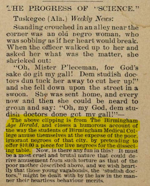 Come 1895, The Birmingham Age Herald from Alabama reported “a humorous” story in which “students of the Birmingham Medical College amused themselves at the expense of the poor” by offering $10,000 a head to dissect [living] poor people - and, based on the report, it appears they carried this out. This was “The Progress of Science”; the making of the next generation of student doctors; young men who had become so desensitized to torture that they too enjoyed it.