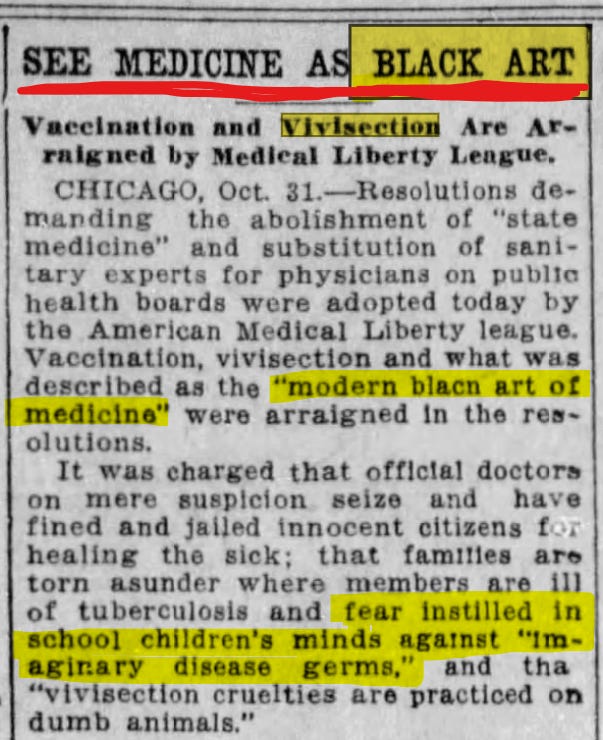 A similar effort followed in Chicago, Illinois to stop the “black art of medicine” and its Vivisection. Citizens also wanted schools to stop making children afraid of “imaginary disease germs” in effort to solicit vaccinations.