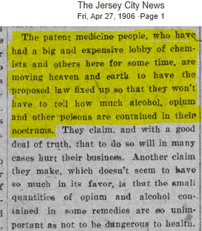 In 1906, the US government was debating the first product labeling laws which would also apply to medicines. The New Jersey City News wrote, “The patent medicine people, who have had a big and expensive lobby of chemists… are moving heaven and earth to have the proposed law fixed up so they they won’t have to tell how much alcohol, opium and other poisons are contained in their nostrums. They claim, and with a good deal of truth, that to do so will in many cases hurt their business.”. Another claim the medicine men made was that the small quantities of poisons in their products were so tiny that they were “unimportant as not to be dangerous to health”.