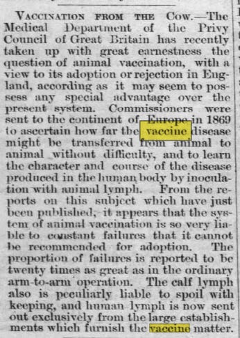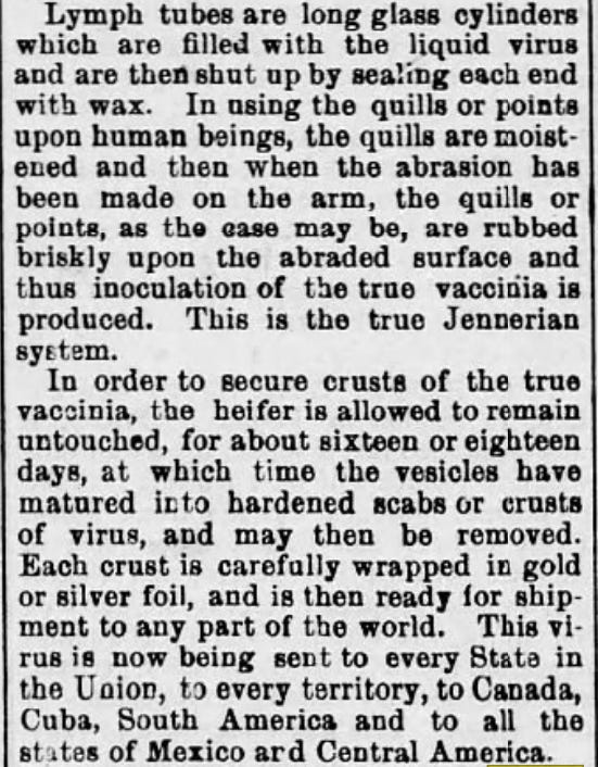 1877 lymph from cow pox https://www.newspapers.com/image/989729336/?match=1&terms=vaccine%20lymph%20extraction