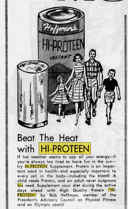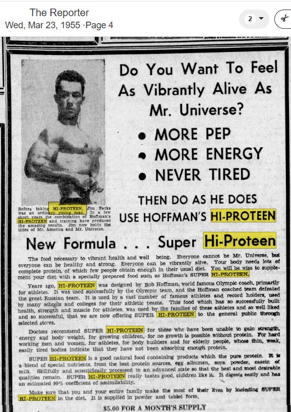 Not long after, a nutritionist and bodybuilding coach named Irving Johnson began selling “Hi Protein” supplements in Hoffman’s health magazine and the supplements were being purchased faster than a $2 hooker on Half Off Friday. It dawned on Hoff that Bragg’s idea wasn’t crazy after all - people really were willing to pay for a product they need to constantly replace - a product they never needed before but would buy repeatedly now if convinced they needed to.