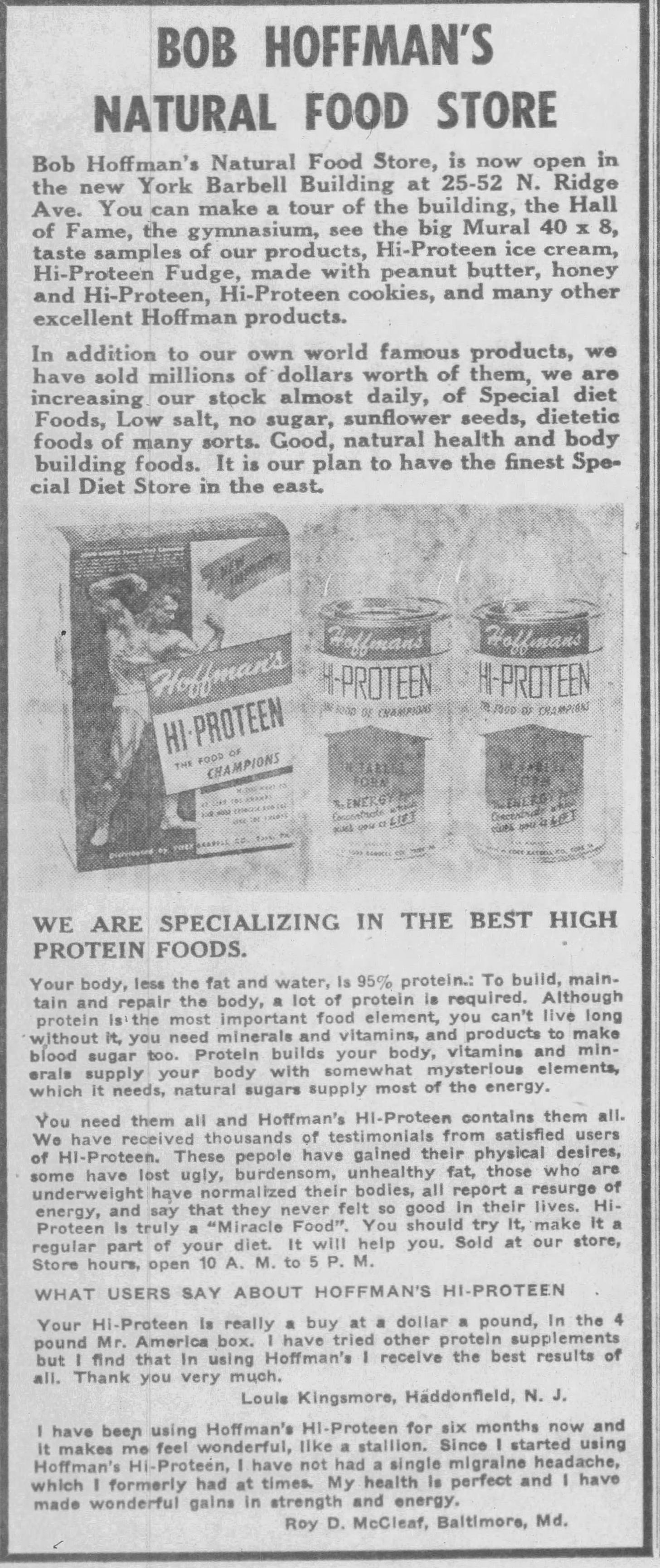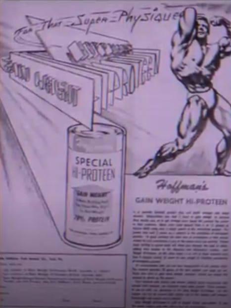 Hoffman then banned Mr. Johnson from his magazine and took over the market. Next the Hoffmeister began running ads in his magazine. These adverts claimed that by consuming his miracle powder people could put on pounds of muscle with ease. He recruited bodybuilders to help spread the word on how incredible his product was. Now super buff dudes were claiming they got their muscles from Hoffman’s Hershey-oar-powder and the public believed it.