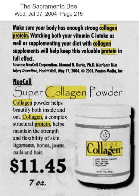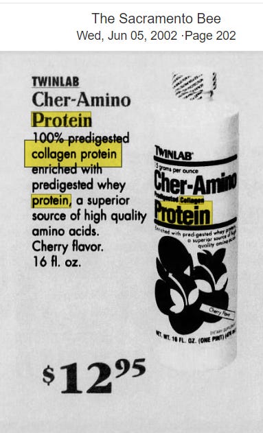 The media did its thing and by the mid-1990s it was official, not only did we need protein, but now we all needed more collagen so eat it, drink it, scrub it into your scalp, inject it into your face, lather it on like lotion, put it in your pipe and smoke it, they didn’t care what method we used as long as we purchased their products.