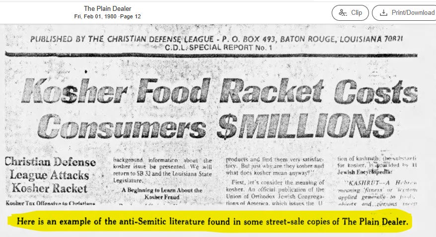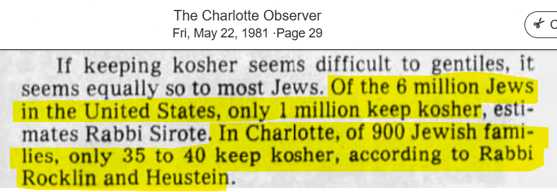 In 1979, the papers pointed out that “Of the 6 million Jews in the United States, only 1 million keep kosher. In Charlotte, North Carolina, there were only 900 total Jewish Families, and of them, only 35 to 40 followed kosher rules.” Despite such a small number of supporters, these foods were in every grocery store across the nation, and nearly all cities and states had kosher food laws and kosher food policing. The policing led to business owners losing their livelihoods for alleged violations.