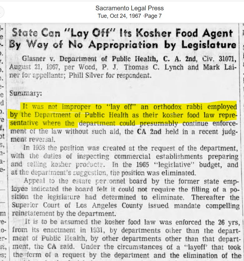 In 1967, the city of Sacramento was forced to lay off its Kosher Food Agent because there was no appropriation by the Legislature regarding funds to be put toward this newly formed government job.