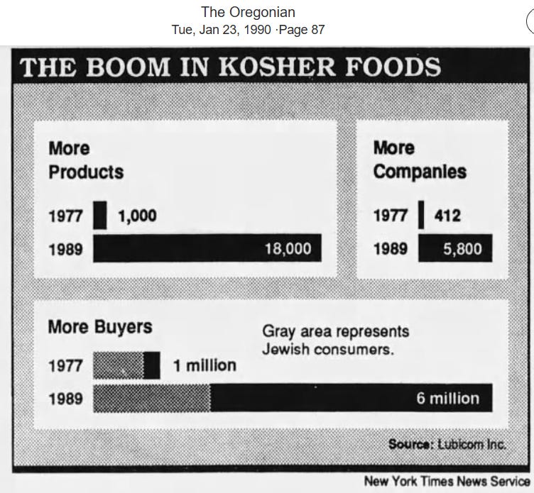 The same year, the Oregonian newspaper displayed a chart showing the massive boom in kosher products and buyers, the vast majority of which were non-Jews.