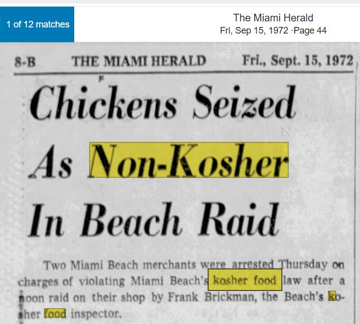 In 1972, kosher food had made its way into hospitals. While this was happening, the Miami Beach food inspector was accused of extortion. From the news article, we learn that rabbis had been overseeing meatpacking plants. The rabbis would tag meat as kosher before it was loaded onto trucks to be shipped. It turns out, this particular rabbi was extorting additional money in exchange for his kosher sign-off.