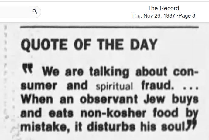 Come 1985, the Kosher Foods Enforcement Bureau (headed by rabbis) was in full swing, conducting “intensive monitoring” of businesses. This Bureau worked alongside the Consumer Affairs Commissioner. In only nine months’ time, the agencies discovered over 700 assorted violations, which raked in over $30,000 in fines (worth roughly $100,000 today). What exactly were these fines for? Per the paper, “Breaching the trust of the Jewish community”.