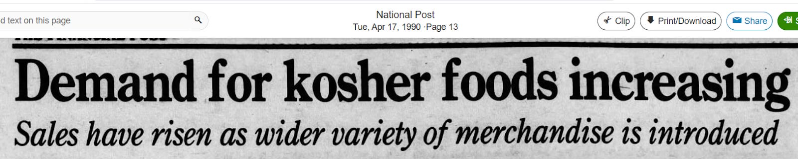 Come 1990, kosher foods were a $1 BILLION a year industry. As more and more products got the kosher stamp, more and more people bought them. This led to the papers exclaiming there was a “demand for kosher foods”.