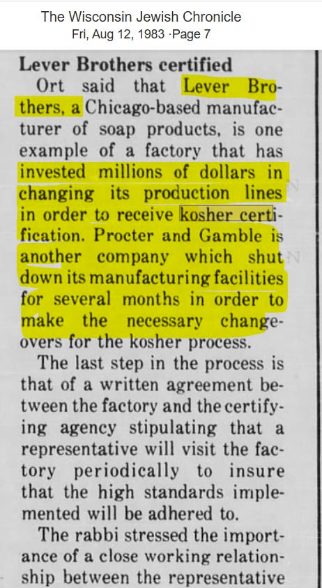 In 1983, Lever Brothers, the Chicago-based manufacturer of soap products, decided to go kosher. They invested millions of dollars in changing their production lines to meet the criteria the rabbi laid out for them. Procter and Gamble then followed suit and shut down their factory so it could undergo conversion.