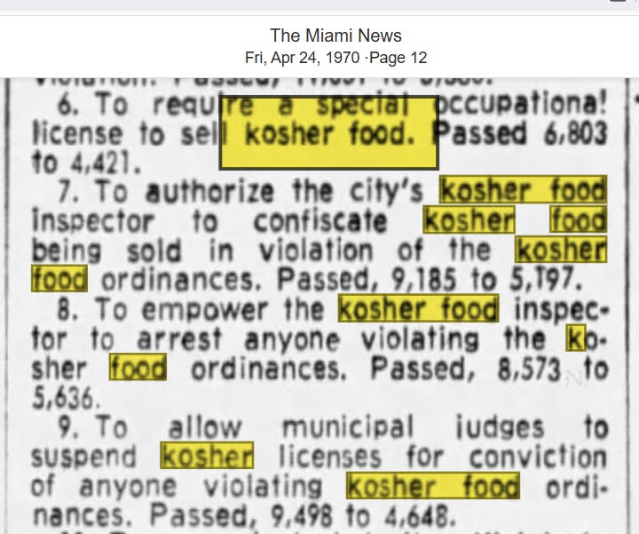 The next year, the Miami Beach public began questioning why they were funding inspectors. They said these costs should be consumed by the Jewish clergy. The newspapers stated the cost to Miami Beach taxpayers was $25,000 annually, just for the rabbi. $25,000 back then is equivalent to $98,293.69 today. So this rabbi was getting paid nearly $100,000 a year to enforce Kosher Food Laws on Miami Beach. These costs do not include the expenses for police to investigate, seize, and arrest, nor do they include the cost of judges and the court system to prosecute individuals. They also do not include the cost to incarcerate those who were found guilty.