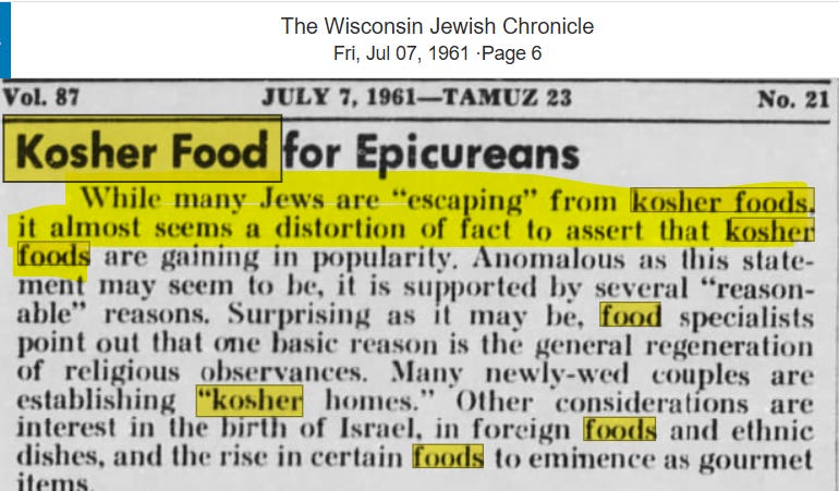 In July of 1961, an interesting article appeared in The Wisconsin Jewish Chronicle. It was titled “Kosher Food for Epicureans” and said that “many Jews are escaping from kosher foods,” but then went on to state that many newlywed couples were establishing “kosher homes”.