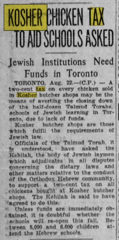 In Toronto, Canada, a 2-cent tax was added to every chicken sold in Kosher butcher shops. They claimed that this money was to fund Jewish schools.