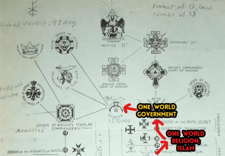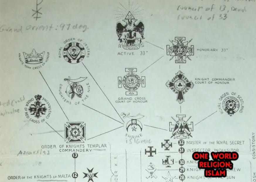 Upon reaching the 18th degree, also known as the Rose Croix, Mr. Shaw learned his new mission which was the first mission of Freemasonry; “…bringing together all men of all religions under the Masonic banner and around the Masonic altar”; a one world religion… with the Karan (Quran) as the guidebook… Let’s start making a chart: