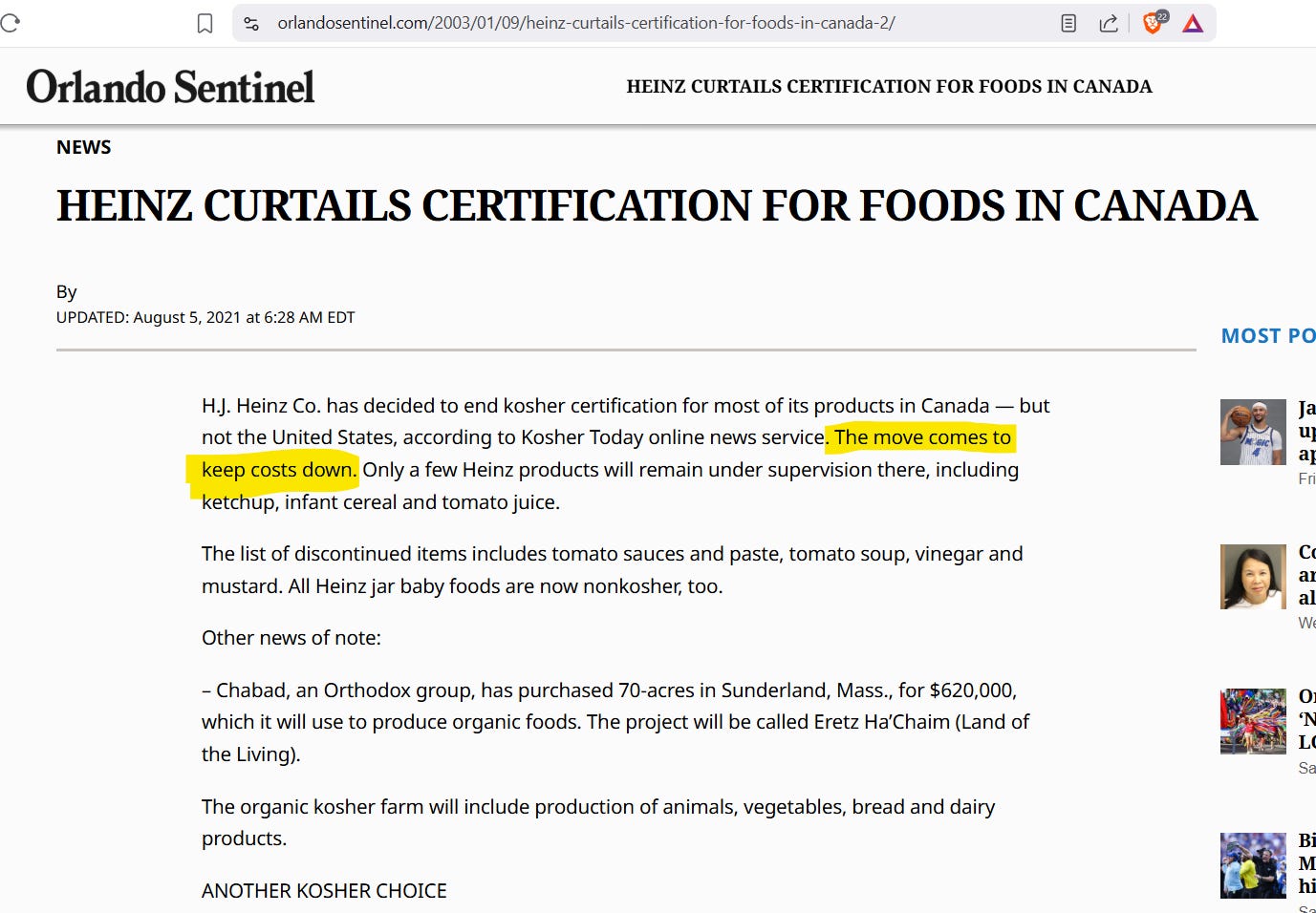 The Albuquerque Tribune, in 2002, stated that total costs for certification were roughly 6 BILLION a year across all US companies. Although we are assured this does not, in any way, impact costs to consumers, nor does it financially hurt the manufacturers, in March of 2003, the Canadian Jewish News reported Heinz of Canada had ended Kosher Certification because the costs were too high. The same would happen again in 2021.