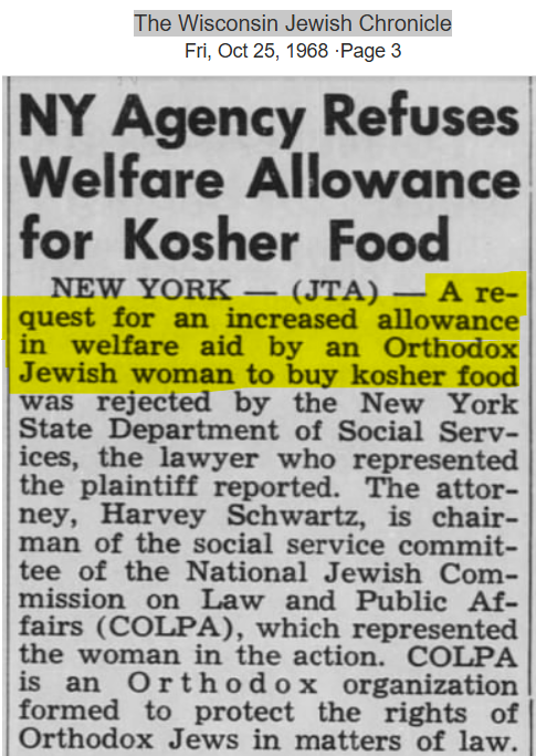 The cost to consumers, per item, for obtaining kosher certification was reported by The New York Times back in 1975 to be 6.5 millionths of a cent ($0.000000065) for a General Foods frozen-food item. They said, “It was so small it barely added anything to the price.” The ADL estimated the added cost to each item runs the consumer less than a penny more, so both parties agree that kosher certification does increase the cost, but it’s justified because the amount is tiny, they say. Keep in mind the added cost they are providing is to obtain certification. Although the Times claims the amount is minuscule, in 1968, which was seven years prior to the Times publication, The Wisconsin Jewish Chronicle reported that an Orthodox Jewish woman was requesting the government increase her welfare aid amount so she could afford kosher foods.