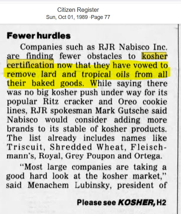 Because strict Jewish dietary laws forbid the use of lard (natural animal fat), as manufacturers began joining the kosher bandwagon, they were forced to remove this ingredient from their products. The replacement? Vegetable shortening. They also had to remove all “tropical oils”, such as coconut oil. This is when companies switched to using canola oil (which is repurposed motor oil!)