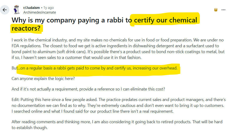 And if you think this scheme is limited to food, drinks, tin foil, soap, postage stamps, kosher grape production at wineries, beer, liquor, and all steel products, think again. This person on Reddit appears to be a business manager looking to reduce costs for his company. He was confused as to why his company is being forced to pay a rabbi to certify their chemical reactors - an object that has nothing to do with food, drink, or medications.