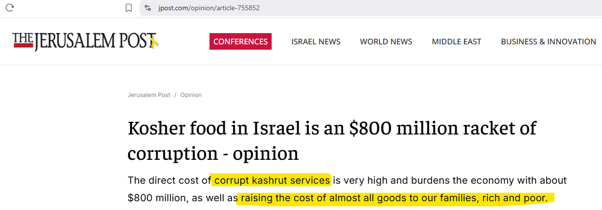 And the reason it needed to be certified was because chemicals are in it, and those chemicals could touch the skin of an Orthodox Jew. Sigma-Aldrich (which is Merck pharmaceutical), has become “a globally recognized leader in kosher ingredient production”. They currently have over 1,200 kosher-certified chemicals in addition to kosher packaging for their products. And all of this is being done for approximately 500,000 United States residents. Folks, do not think all Jews are on board with this program, because they’re not. Recently, an article appeared in the Jerusalem Post called “Kosher food in Israel is an $800 million racket of corruption”. This article, written by a Jew, outlines how the kosher food scheme is “raising the cost of almost all goods” to all families.
