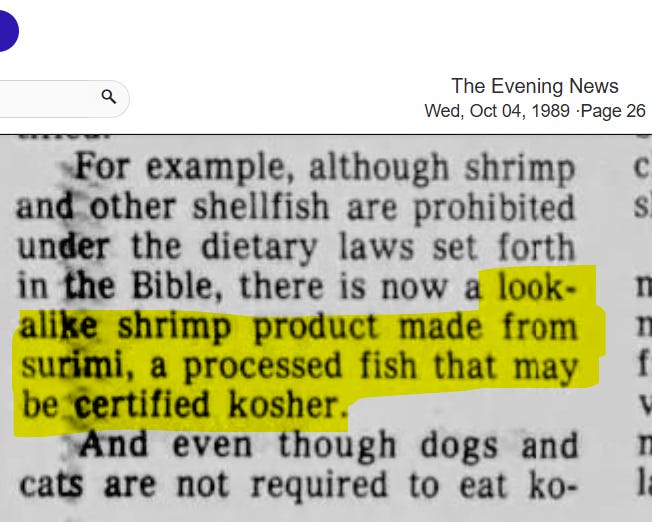 Because shrimp are not kosher, artificial “look-alike” shrimp needed to be made from surimi, a fish that can be stamped kosher, provided the manufacturer followed all of the kosher rules.