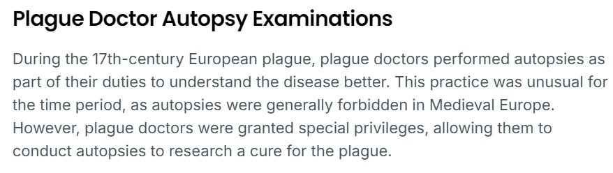Yep, the plague doctors were responsible for cutting up the patient after death… to determine the cause of death… which is bizarre because the entire reason they were there to begin with was the plague, therefore the cause of death should have been known…. right?…