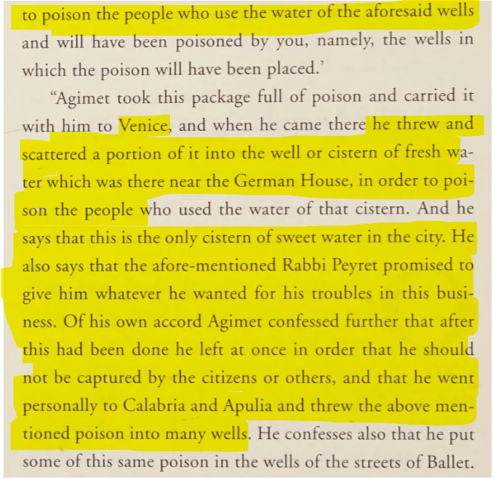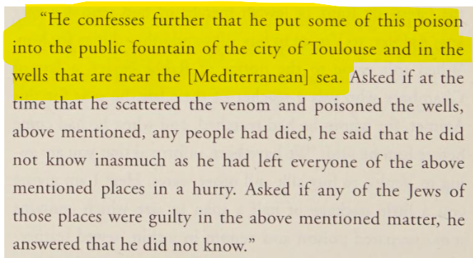 On October 31st, 1348, two years into the plague, a high-ranking member of the religion confessed during a legal proceeding that he was directed by a Rabbi to poison the public water wells. Here is his confession to the court: