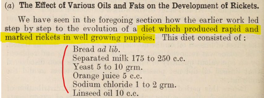 His studies claimed if cod liver oil, suet, or meat in large quantities was given to the puppies, they would not develop rickets. I have no way to verify if this was true, but that’s what he claimed; all that was missing from a dog’s diet of bread was some cod liver oil - with this single substance, taken from a fish who lives 600 meters deep, the dog would be in pristine health (sounds pretty damn sketchy if you ask me, but I can’t disprove it.)