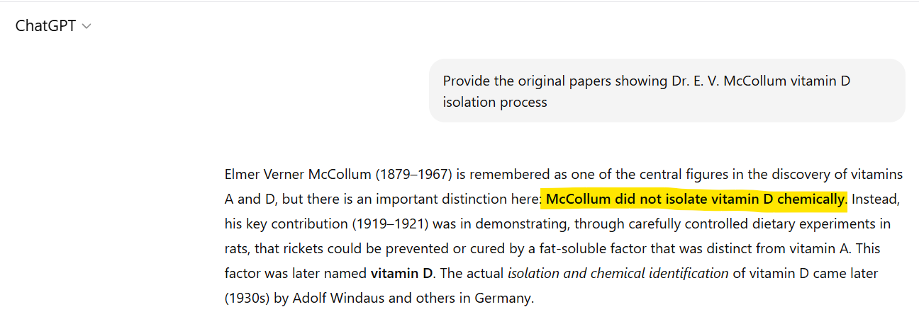 While this was going on, on June 19, 1922, the Times reported that a team led by Dr. E. V. McCollum, “the famous biochemist,” had “ ‘captured’ a hitherto unknown vitamin, which has been labeled vitamin D, the specific purpose of which is the protection of bone growth and the prevention of the disease known as rickets.”. History then documented this as the first isolation of vitamin D, but ChatGPT disagrees, stating McCollum never isolated anything.