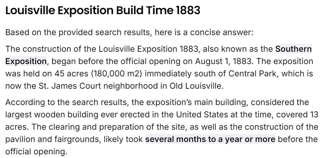 The Louisville, Kentucky Exposition (World’s Fair) of 1884 was scheduled to run for only two total months. It spanned 45 acres with the main building covering 13 of them: