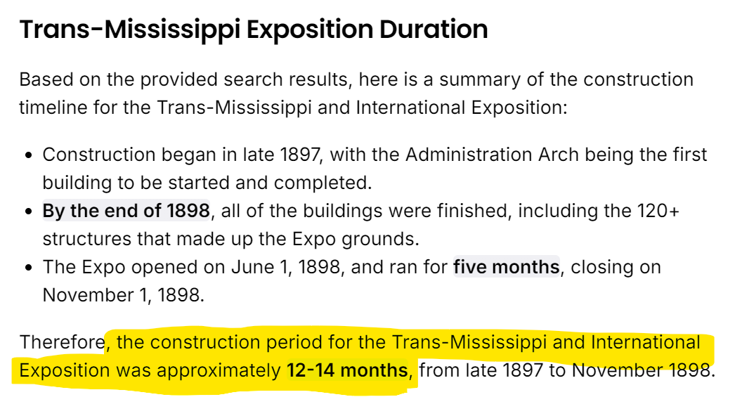 The Trans-Mississippi Exposition of 1893 covered 180 acres, “The entire fairground was roughly equivalent to 270 standard American football fields.”