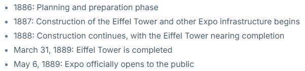 Building took only a couple years but strangely, the majority of the work time went into the Eiffel Tower, which was one of the structures they did indeed create:
