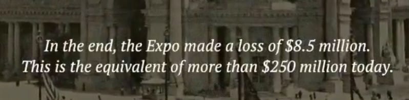 Although some funding came from the exact same elites you would expect to be funding these things, the majority of the expense was carried by US! And by “US” I don’t mean the United States, I mean literally us, the taxpayers! Let me give you some examples of how much of a loss these fairs were:
