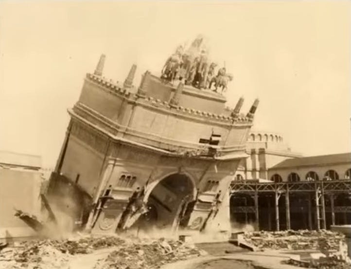 … then it means the structures were already existing. Meaning, they found a mini-city and threw an event within it, claiming to have built it when no such thing ever occurred - and this is what we will diving deep into in this series. But before we move on, just to be completely clear, the fair organizers did indeed build some buildings, but you can easily tell which ones they are. For instance, this is one of the buildings they made. It came toppling down: